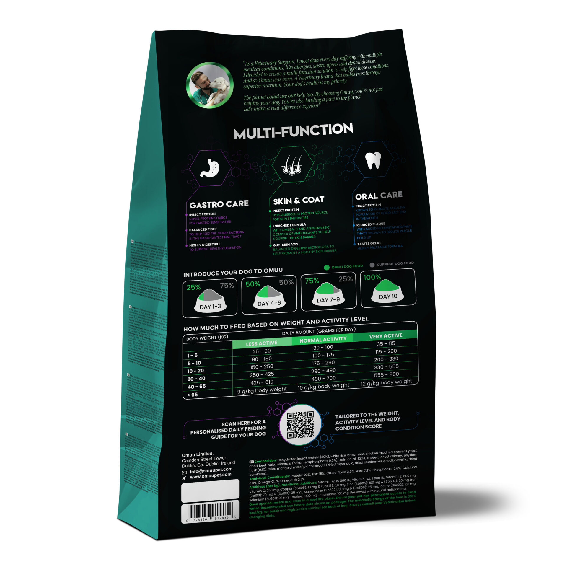 Omuu was created by Dr Frank, who has over two decades of veterinary expertise. Dr Frank has established himself as a leading figure in Veterinary medicine and pet nutrition. As a graduate of the UCD Veterinary School, his early career focused on small animal practice, where he witnessed firsthand the growing challenge of food sensitivities in dogs.